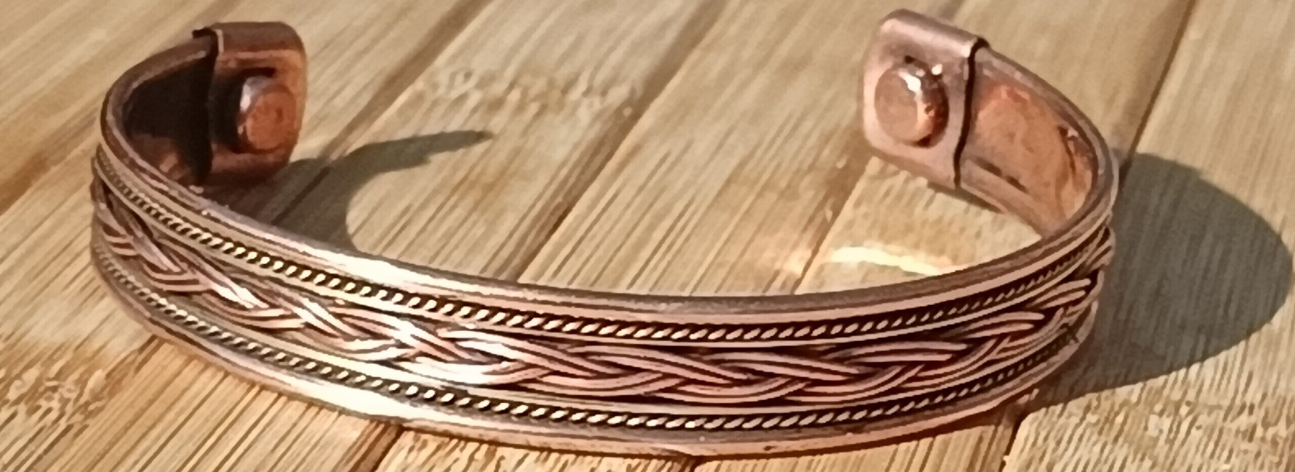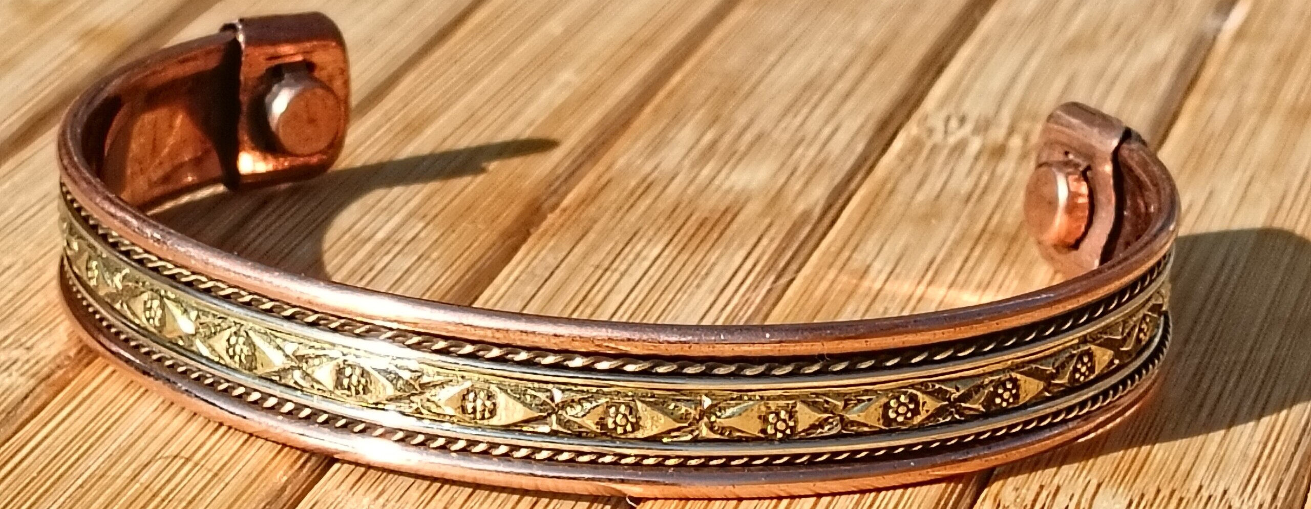 Copper bracelet with magnetic elements and a warm yellow–red hue